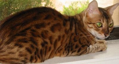 Sakia is a true sweetheart and extremely typey- she is the essence of wild. She has an impressive pedigree with Grand Champion to Quadruple Grand Champion ancestry including Grand CH Millwood French Lace, OS CH Millwood Italian Filigree, RW Quadruple Grand CH Dicaprio of Starbengal to name a few and she is an F5: 5 generations from Asian Leopard Cat "Taro". Sakia is very foundation in her structure looking more like an F2 and she looks just like a Leopard Cat with her nice thick, long, deep body, thick tail, great head and profile and beautiful black outlined rosettes. It is so much fun watching Sakia play because when she plays hard she lets out a roar and pants plus she is wildness personified! She is keenly intelligent and she is an expressive girl. By 3 and 1/2 months old she learned to roll over, lie down, beg and jump up onto my shoulder when commanded, "up!" Giving the best of both worlds, she is very athletic, loving to play but she also loves to be held...for 4 solid hours at "nana's" every night! Thank you Karen (of Kingsmark) for allowing me to have such an amazing cat! Sakia has been a huge asset to my program - She is now retired and living in her forever home with Pat.